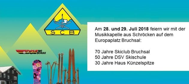 Jubiläum beim Skiclub Bruchsal Der Skiclub feiert einen runden Geburtstag. Und nicht nur das. Er besitzt nun auch schon seit 30 Jahren ein eigenes „Haus Künzelspitze“ mit über 40 Betten in Schröcken/Unterboden im Bregenzer Wald. Das sind zwei gute Gründe für die Vorstandschaft und das Organisationsteam ein zünftiges Fest nach alter Tradition des SCB zu feiern. Hierzu sind natürlich alle Mitglieder und Freunde des Vereins sehr herzlich eingeladen.